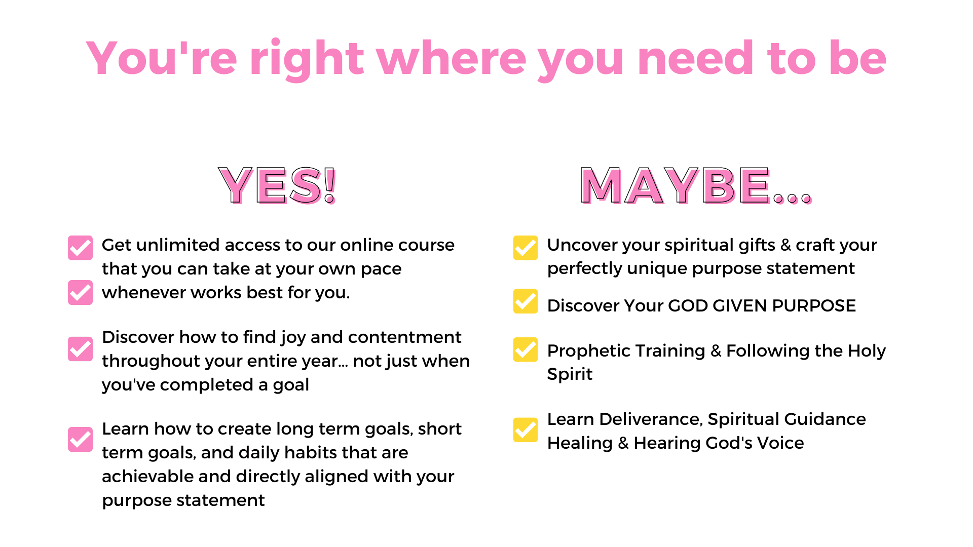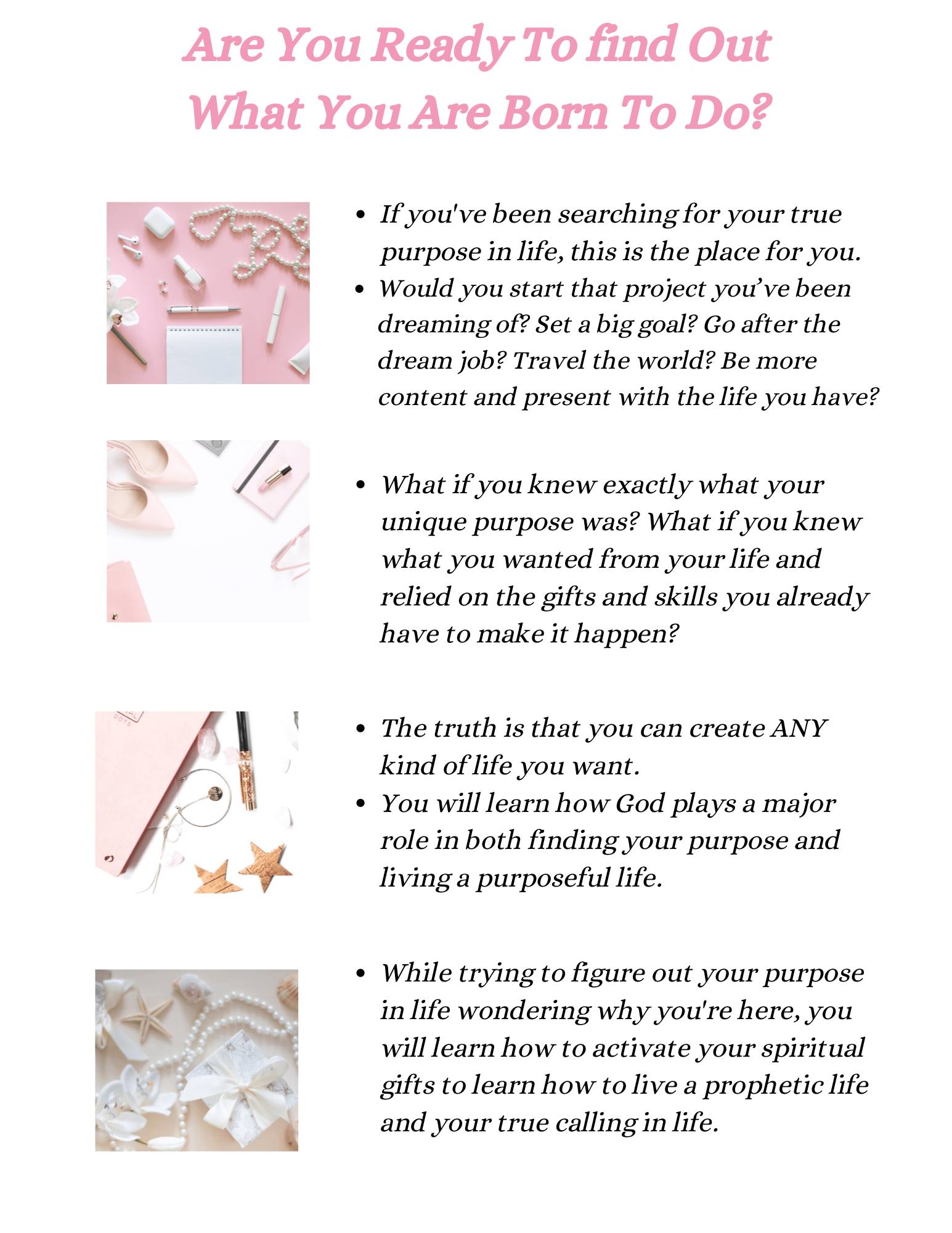 I'm here to help YOU discover what YOUR purpose is so YOU can walk into it. YOU will learn how to hear God's voice for YOURSELF to activate all the spiritual gifts in YOUR life and YOUR true calling in YOUR life.