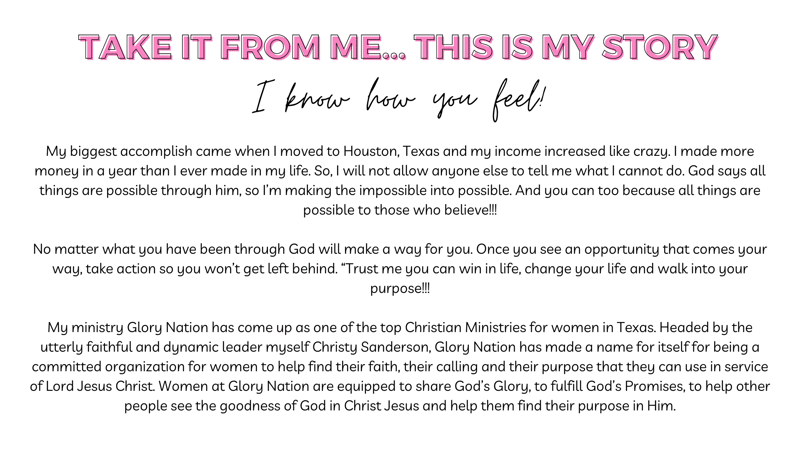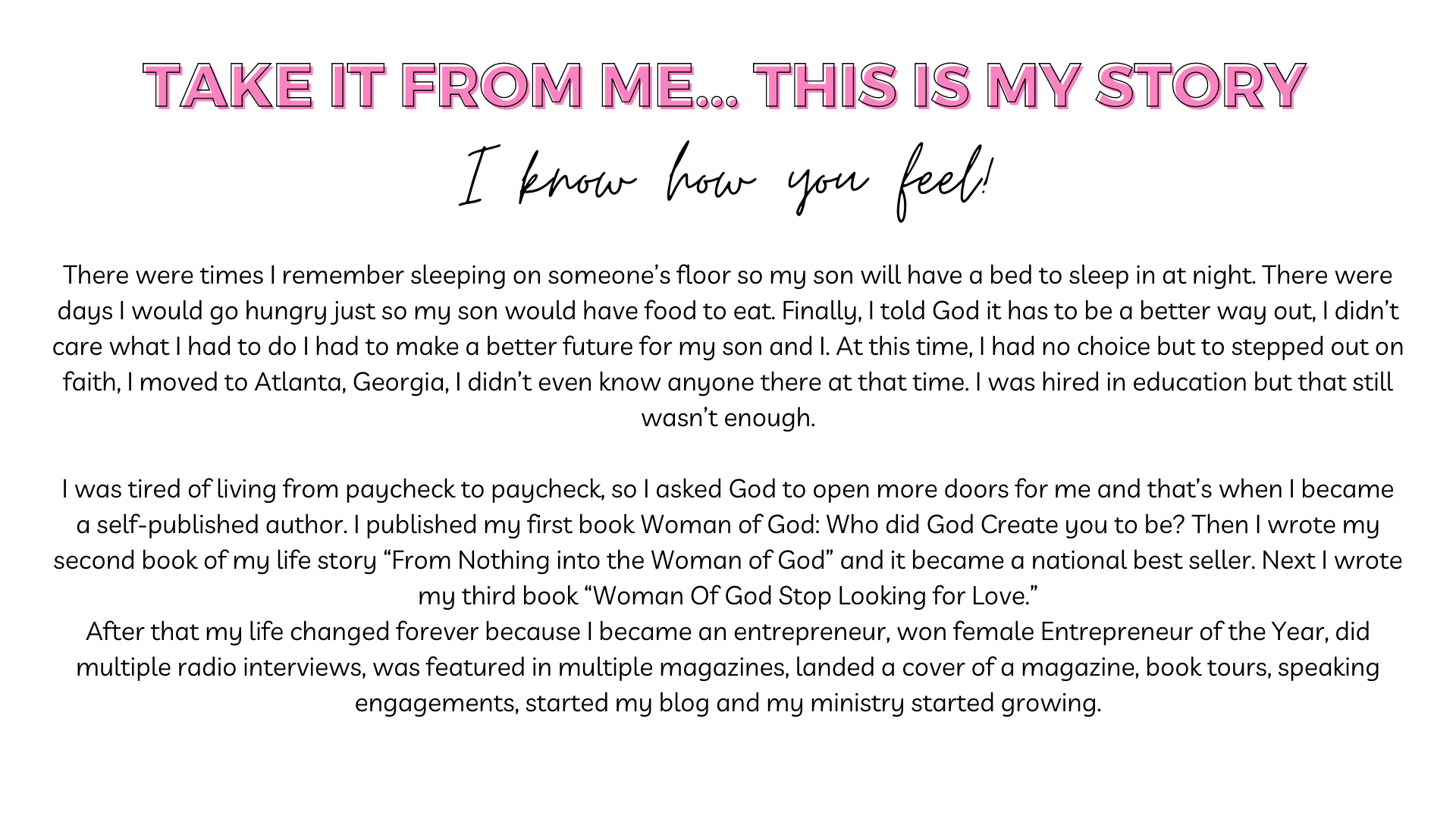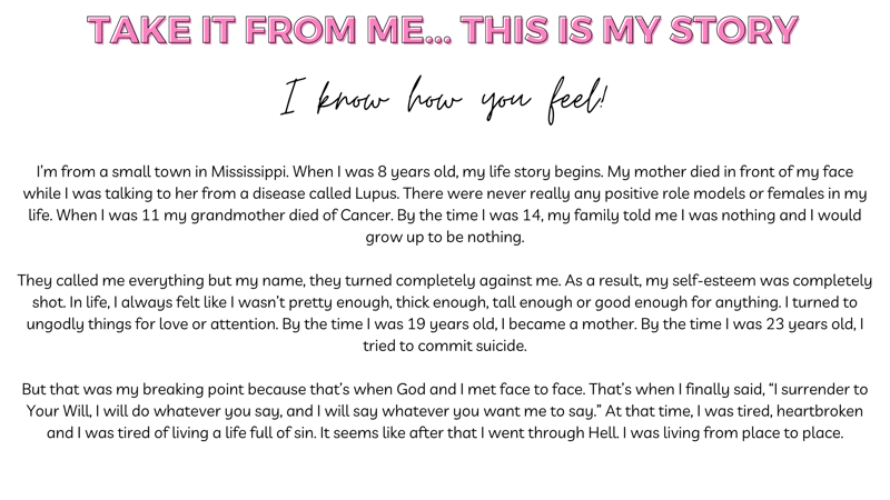 That's why I'm here to help YOU WALK INTO YOUR PURPOSE!!! Now I went through it the long way so I can show YOU how to get there the a quicker way.